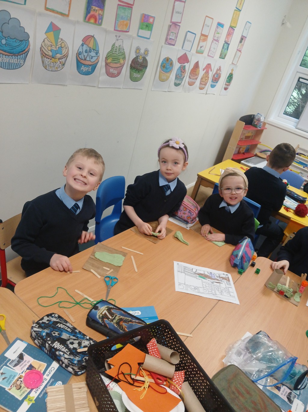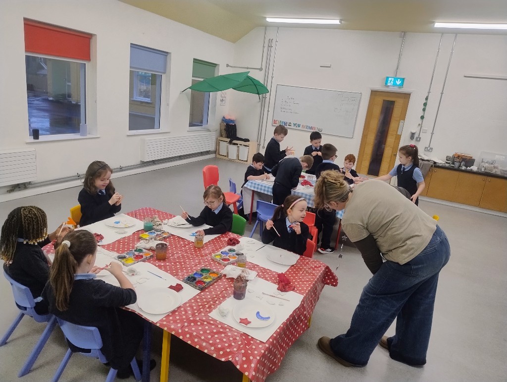 Junior and Senior Infants having fun in art this week decorating their gingerbread houses made using milk cartons.